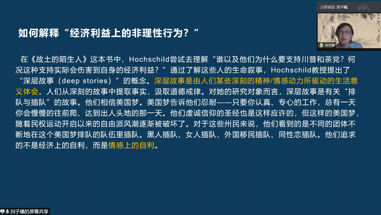 刘子曦老师向大家介绍了“综合文本”的方法论构建,通过访谈浓描、活的故事和解读心事理解他者的生活经验,并在此基础上挖掘理论的价值,达到知识生产。强调必须用贴近生活文化的理解方式去把握叙事,记住事物本来的样子,避免因为非常理性而把个体异类的思想文化“化整为零”导致其价值和意义的丢失。刘子曦老师分享了叙事分析应用的一个案例,帮助大家在现实语境下更好的把握叙事背后所隐含的情感、精神与价值等方面的内在联系。