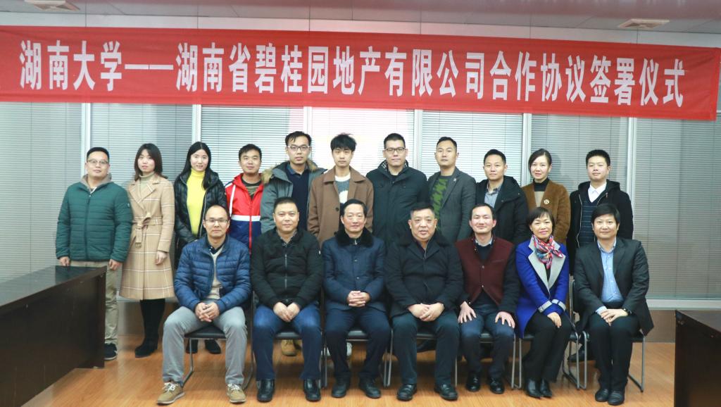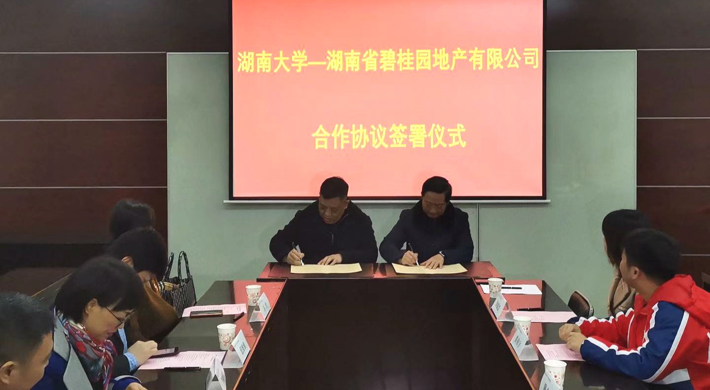 与湖南省碧桂园地产有限公司合作协议签署仪式在法学楼404举行,双方就高层次人才互聘、基地共建、联合研究、协同育人等事宜,达成战略合作意向。碧桂园集团副总裁兼湖南区域总裁黎晓林、湖南区域高级副总裁周文理、湖南区域营销大区总经理莫迟等一行九人代表公司参加签署仪式;麻豆瓜网