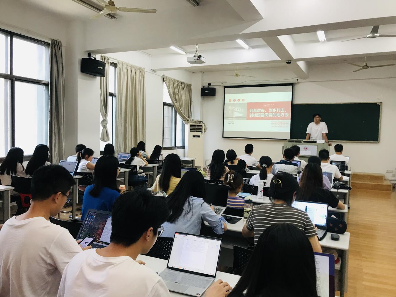会上,王浩讲述了自己七年来六次“三下乡”的社会实践经历,其中包括了2015年7月在湖南省花垣县开展的苗族传统文化·普法宣传·关爱空巢老人志愿活动,2017年7月至9月在湖南省隆回县、宁乡市开展的“情牵脱贫攻坚”调研工作,2018年7月在湖南省长沙县、江西省宜春市开展的普法宣传与廉政调研,2019年7月在湖南省石门县开展的“乡村振兴”、“精准扶贫”战略实施情况调研等。此外,他还结合了优秀的学长学姐投身基层的工作经历,分享了三点感悟:一是提升自身能力,在组织、调研、总结的过程中增长才干;二是坚定理想信念,在学习、实践、反思的过程中升华理想;三是了解社情国情,在走访、交流、记录的过程中开拓视野。最后,他勉励在场研究生党员投身乡村振兴,到基层去、到乡村去、到祖国最需要的地方去。