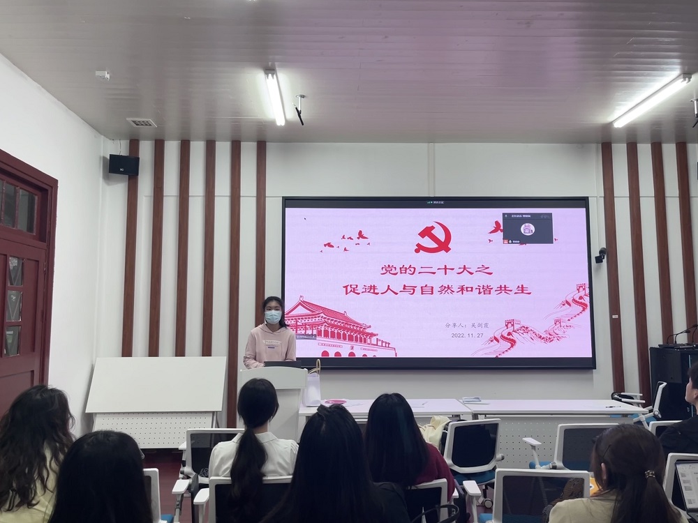 首先,由支部成员吴剑霞同志进行“微党课”分享。该同志结合党的二十大报告中的“绿色发展”板块,阐述了人与自然和谐共生的必要性和可行性。接着,对广州市海珠湿地公园这一具体实例进行讲解,该公园是全国首例“只征不转”的生态保护机制创新典范。