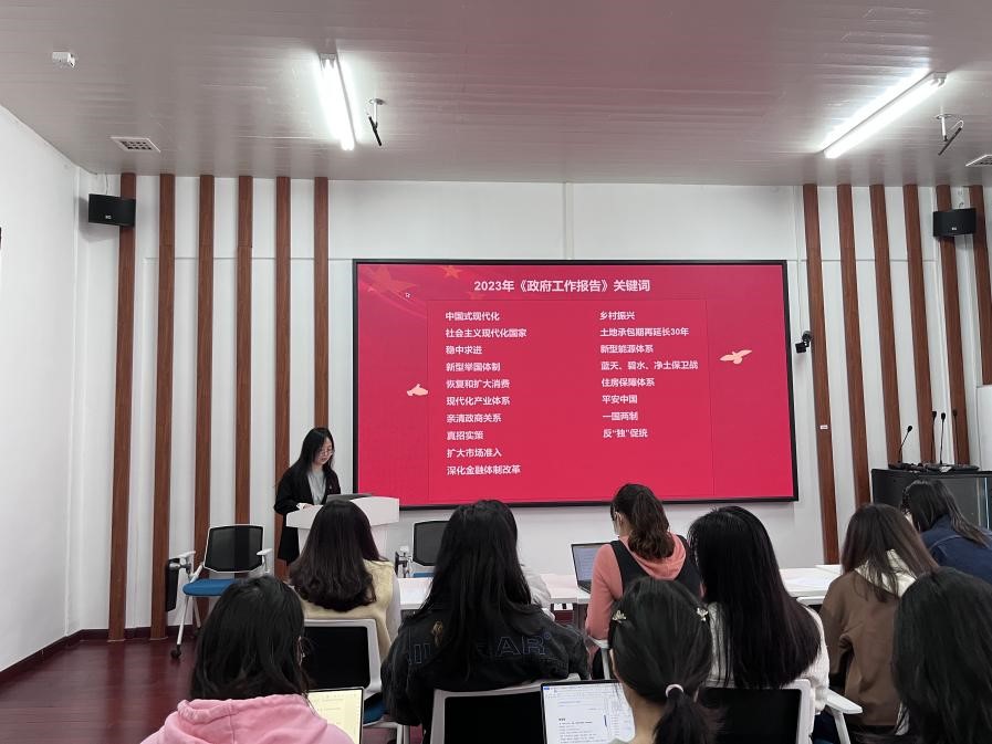 硕士研究生第一党支部在校党员在院楼221共同学习2023年第一次党课。“紧跟时事热点、学习‘两会’精神”是本次党课的主题。