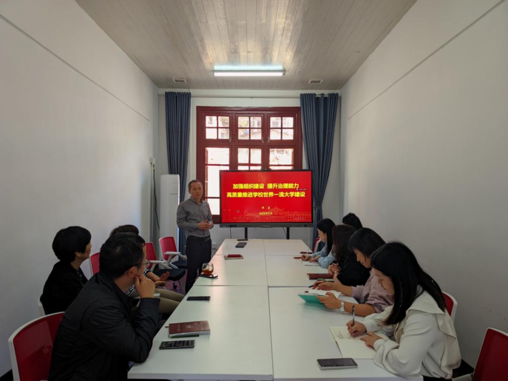 宋杰向全体与会成员传达和解读了学校暑期工作研讨会的精神,并重点分析解读了校党委书记邓卫工作研讨会上的讲话精神。宋杰指出,要深刻领会、深入贯彻学校对组织建设和主题教育工作所提出的要求,发挥好管理人员的关键作用,将相关要求、精神与学院工作实际相结合,提升学院的管理人员的凝聚力和战斗力。