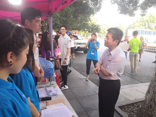 今年的迎新情况,并与志愿者们亲切交谈。