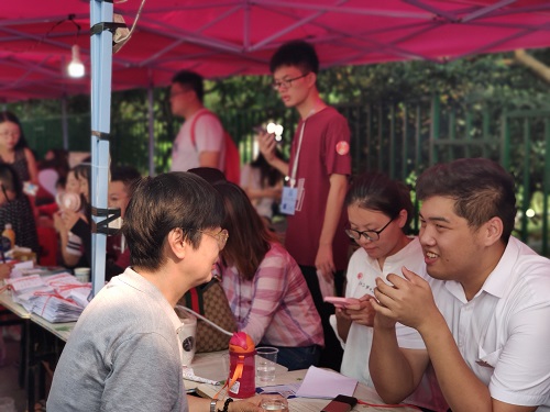 在东方红广场迎新棚组织迎接2019级新生,共迎接前来报道的59名新生,其中男生15名,女生44名。