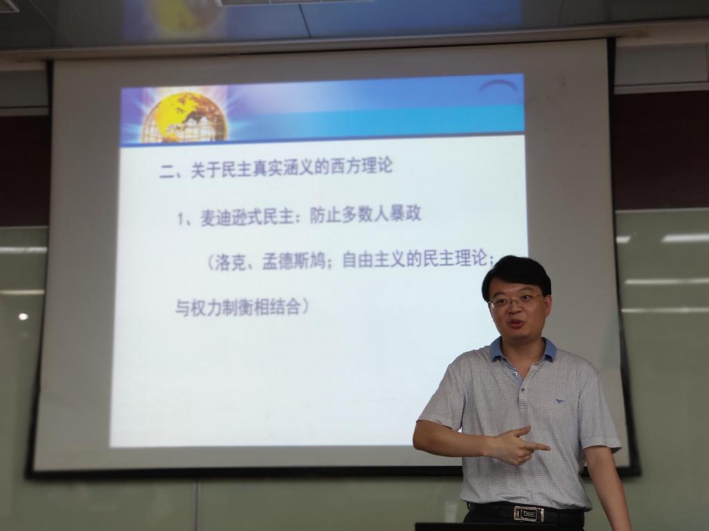 行政管理党支部书记杜倩博着眼于习近平总书记在党的十九大报告中有关民主的论述——“有事好商量,众人的事情由众人商量,是人民民主的真谛”,对民主涵义进行了讨论。通过对罗伯特·达尔、卢梭、洛克等人的西方民主观念的深层解读,提出了民主真实涵义在中国的回答,寻求人民民主的真谛。
