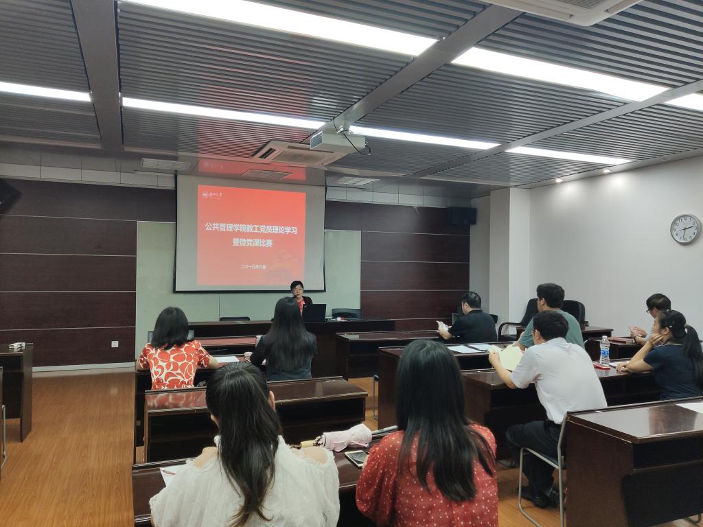 党委组织开展了教工党员党支部委员“微党课”比赛,行政管理党支部书记杜倩博,支部委员郭渐强、刘细良,公共政策研究联合党支部书记程聪慧,支部委员方放,机关党支部书记李释然、支部委员杨锦滔、赵呈戏参加微党课比赛,全体教工党员参与打分评审。