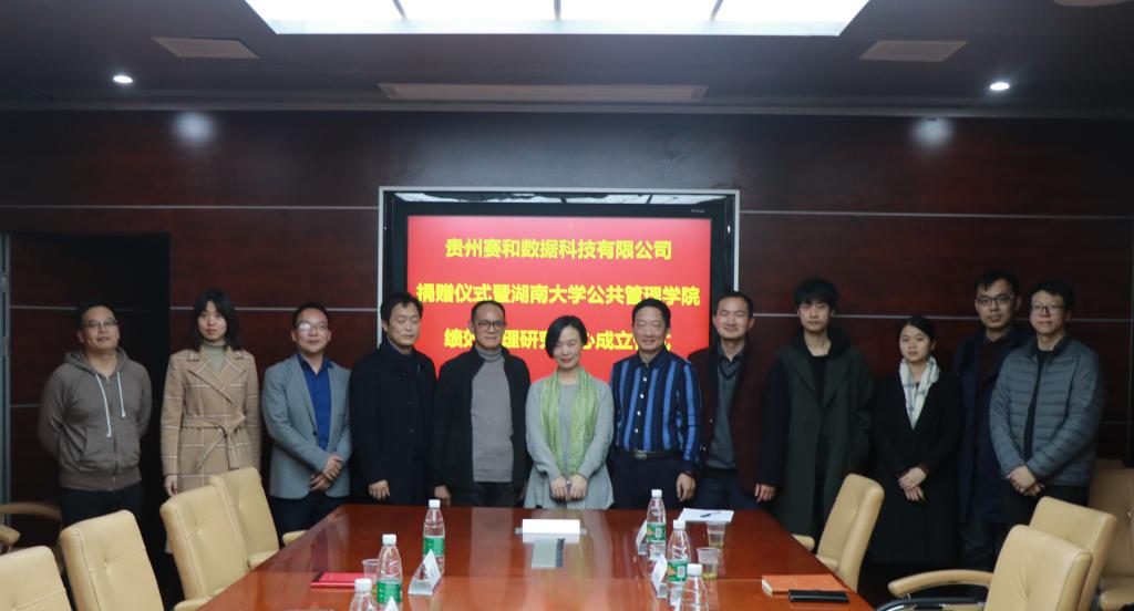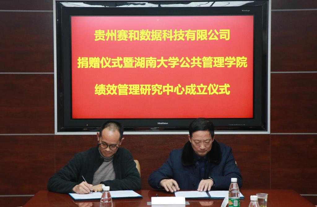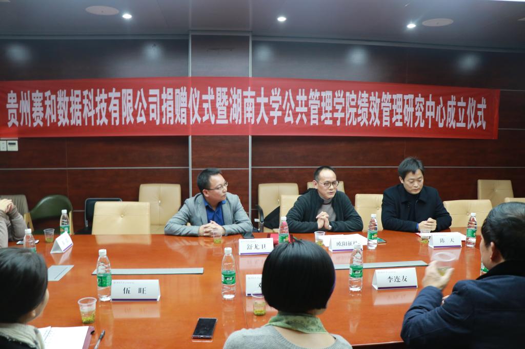 绩效管理研究中心成立仪式在405会议室举行,贵州赛和数据科技有限公司总经理欧阳征林、副总经理陈天、营销总监舒尤卫代表公司参加捐赠仪式,麻豆瓜网