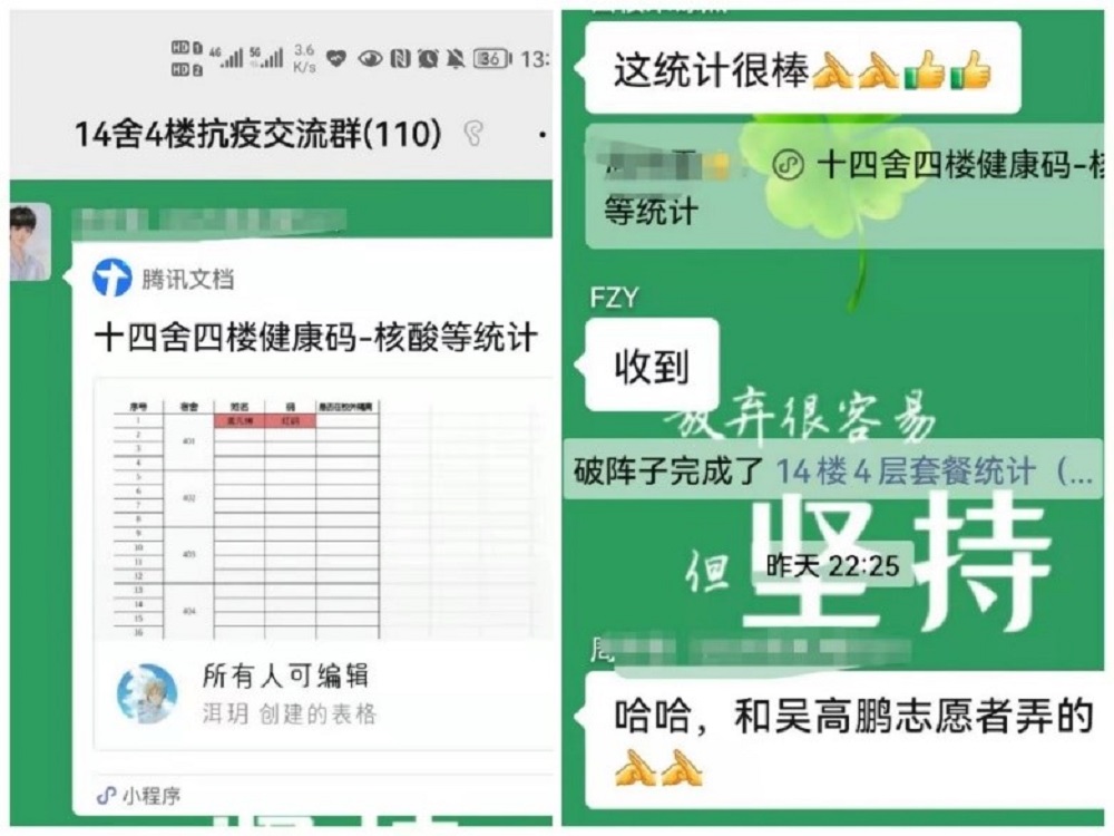 学生互助文档值班,累计排查、核对、回复、上报信息140条。他还担任志愿者协助楼层负责人,先后完成四楼健康码-核酸统计在线共享文档设计工作,一小时内紧急排查所在楼层109人健康码、核酸检测实施情况,并负责所在楼层三个红码黄码寝室,三餐带饭工作。