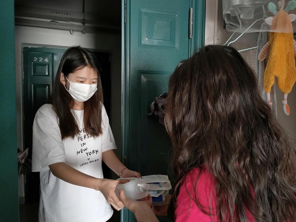 (曲文英同学在分发防疫物资)