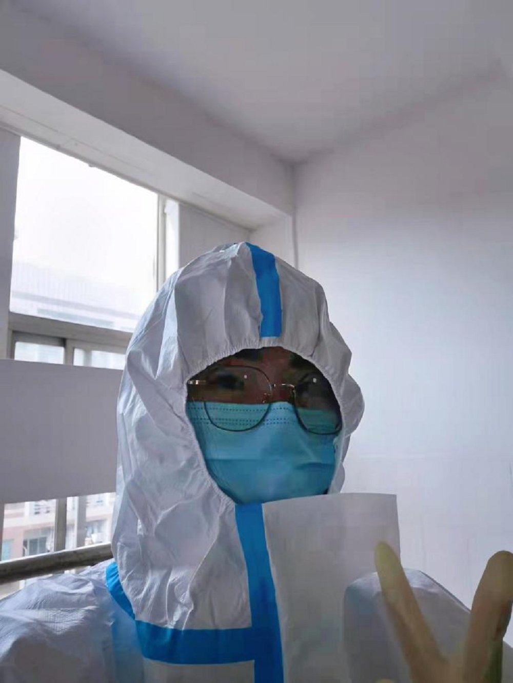 (刘媛同学身着防护服在工作)
