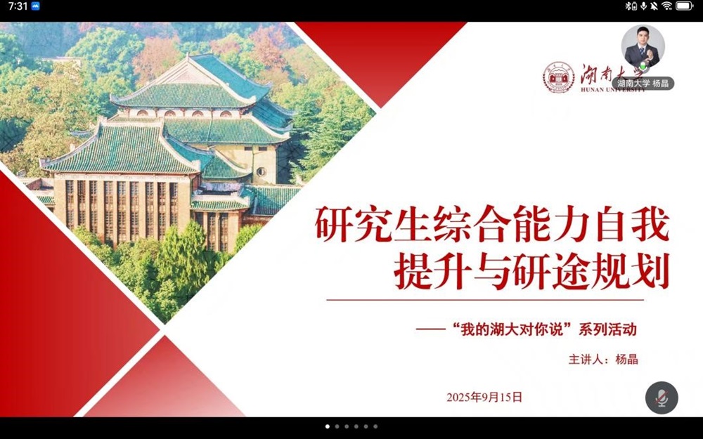 “我的湖大对你说”活动顺利开展,公共健康与社会保障研究所所长、副教授、博士生导师杨晶老师为全体新生带来了一场题为《研究生综合能力自我提升与研途规划》的专题讲座。杨晶副教授从自身丰富的教学与研究经验出发,鼓励同学们尽快实现从“学习者”到“探索者”的角色转变,强调研究生阶段应注重批判性思维与创新能力的培养,通过科学方法拓展学术视野,实现从知识积累到学术创造的飞跃。
