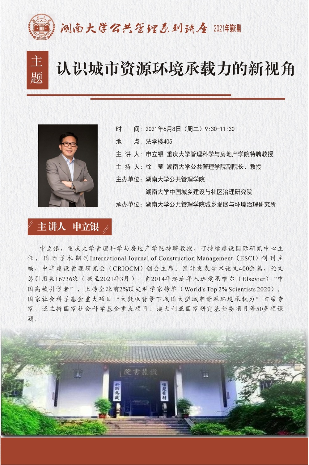 申立银,重庆大学管理科学与房地产学院特聘教授、可持续建设国际研究中心主任,国际学术期刊International Journal of Construction Management(ESCI)创刊主编,中华建设管理研究会(CRIOCM)创会主席。累计发表学术论文400余篇,论文总引用数16736次(截至2021年3月),自2014年起连年入选爱思唯尔(Elsevier)“中国高被引学者”,上榜全球前2%顶尖科学家榜单(World’s Top 2% Scientists 2020)。国家社会科学基金重大项目“大数据背景下我国大型城市资源环境承载力”首席专家,还主持国家社会科学基金重点项目、澳大利亚国家研究基金委项目等50多项课题。