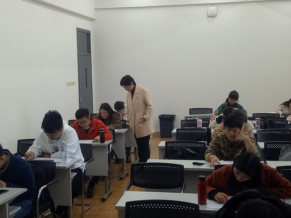 正式开考之前,付蓉芬向所有参考同学说明了此次考试的用意,表示考试不是目的,而是希望以考促学,通过考试的方式,让大家在考试前去认真复习题库知识,去详细了解“两学一做”精神内涵。中午1点,考试正式开始,整个考试过程中,同学们奋笔疾书,秩序井然,付蓉芬往返于三个考场认真巡视。根据同学们的答卷的大致情况来看,绝大部分同学对基础知识掌握良好,同学们对学党的十九大报告、十九届四中全会公报、党章、《中华人民共和国宪法》、《习近平关于“不忘初心、牢记使命”重要论述选编》、《习近平新时代中国特色社会主义思想学习纲要》等都有比较深入的了解。