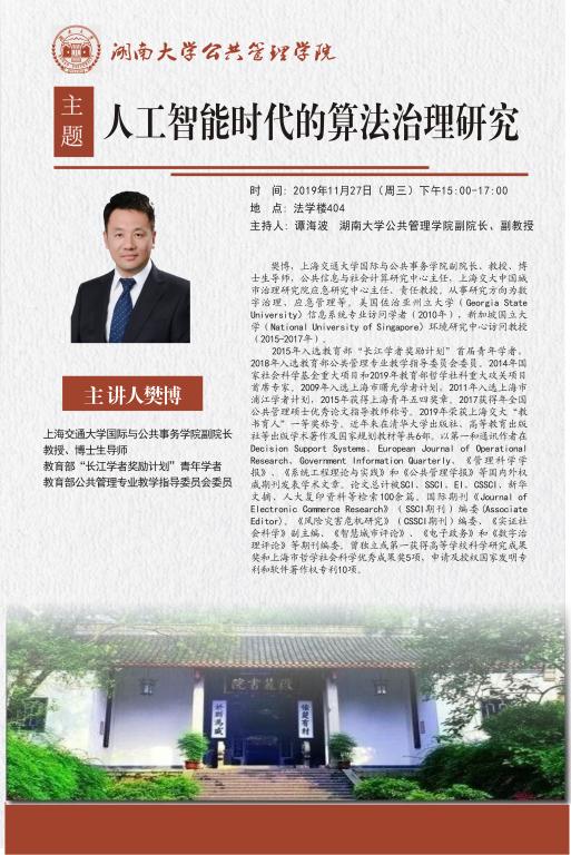 樊博,上海交通大学国际与公共事务学院副院长、教授、博士生导师,公共信息与社会计算研究中心主任,上海交大中国城市治理研究院应急研究中心主任、责任教授。从事研究方向为数字治理、应急管理等。美国佐治亚州立大学( Georgia State University)信息系统专业访问学者( 2010年),新加坡国立大学( National University of Singapore)环境研究中心访问教授( 2015 2017年)。