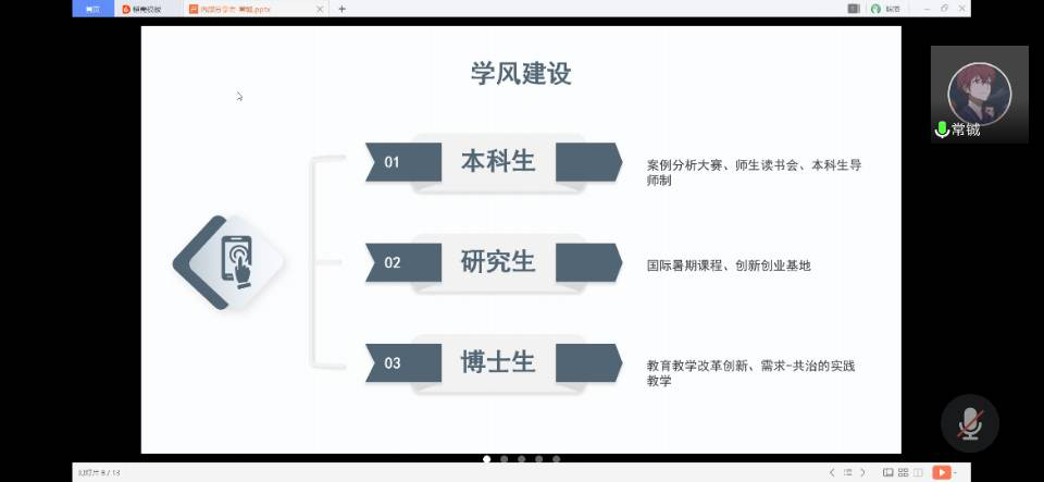 常铖同学从麻豆瓜网简介 、学风建设、课程与就业三个方面进行了学院及专业介绍。目前麻豆瓜网 已经形成了一支水平较高、潜力强劲的师资队伍,学院工作获得国家部委大力支持,并已同英国拉夫堡大学、加拿大贾纳大学、香港城市大学等海内外知名高校建立了"学科合作伙伴"关系。学院通过多项特色活动开展学风建设,培养学生专业素质强,连续三年本科生升学率保持在30%以上,初次就业率均为100%。