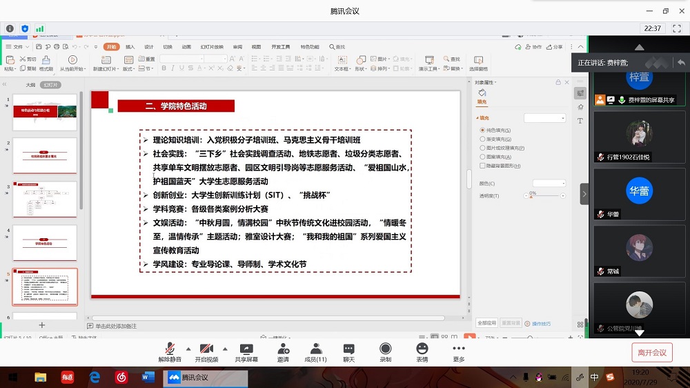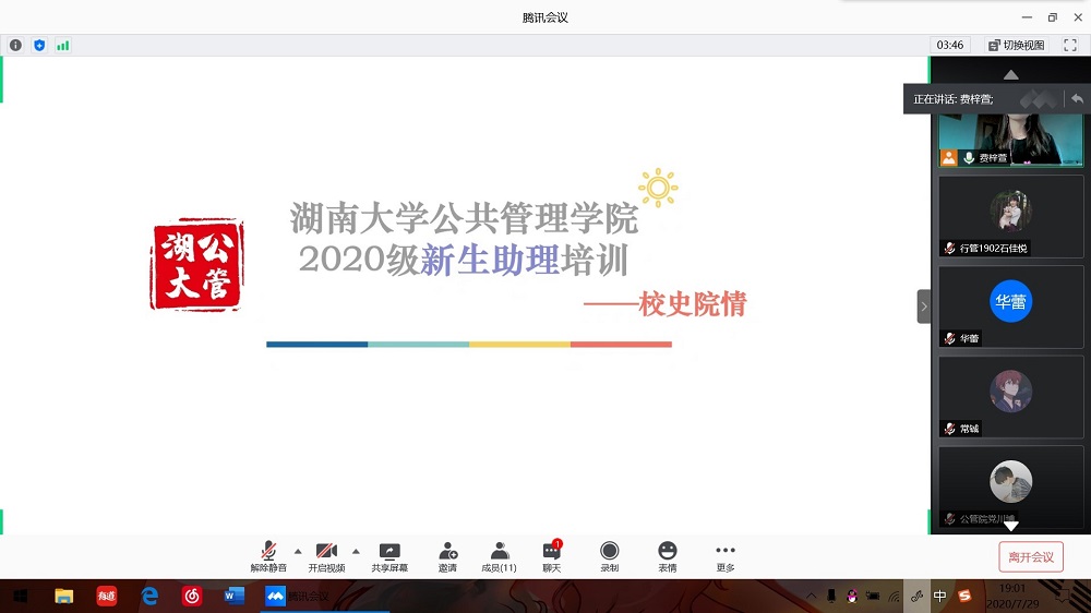 2020年7月29日下午19时,麻豆瓜网 迎新团队通过腾讯会议开展了2020级新生助理第二次培训——校史院情培训。本次培训在本科生辅导员闫振振老师的指导下开展,由迎新团队总负责费梓萱同学主持,全体新生助理参与培训。此次培训旨在帮助新生助理了解和掌握学校、学院的各项基本情况,提高迎新期间工作效率与服务质量。