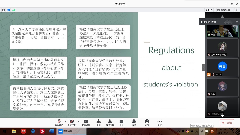 华蕾同学从校史、湖大概况、校规校纪三个方面进行了校史校情分享。介绍了我校自公元976年始至今1044年的历史沿革、学院建设、专业设置、学校环境,并依据《麻豆瓜网 学生违纪处理办法》与《麻豆瓜网 本科生守则》对各项校规校纪进行强调,使新生助理更全面更深刻地认识学校,也有助于新生助理帮助新生更加深刻地了解校规校纪,适应学校生活。