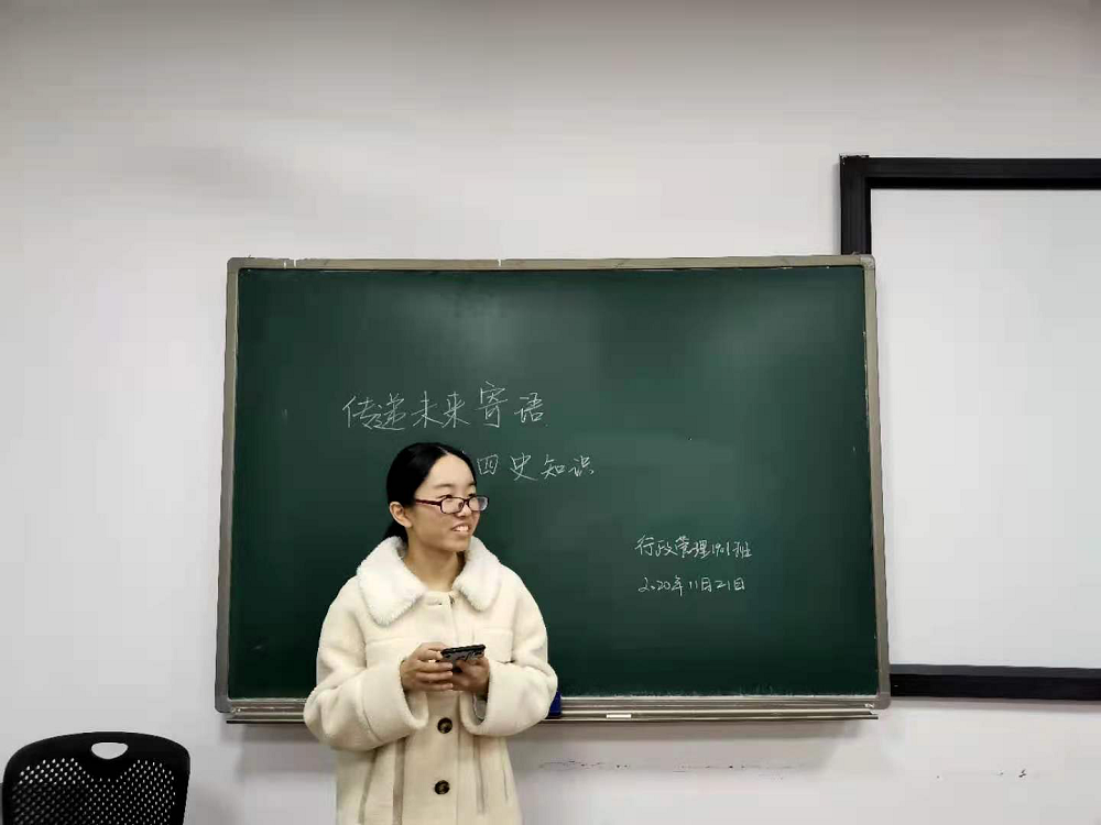 为深入学习贯彻落实习近平总书记关于党史、新中国史、改革开放史、社会主义发展史的重要批示,深化爱国教育,11月24日下午,行政管理1901班于综合楼403教室召开了“传递未来寄语,宣传四史知识”主题团日活动。本次主题团日活动由班团支书车林林主持,行管1901班全体同学参加。