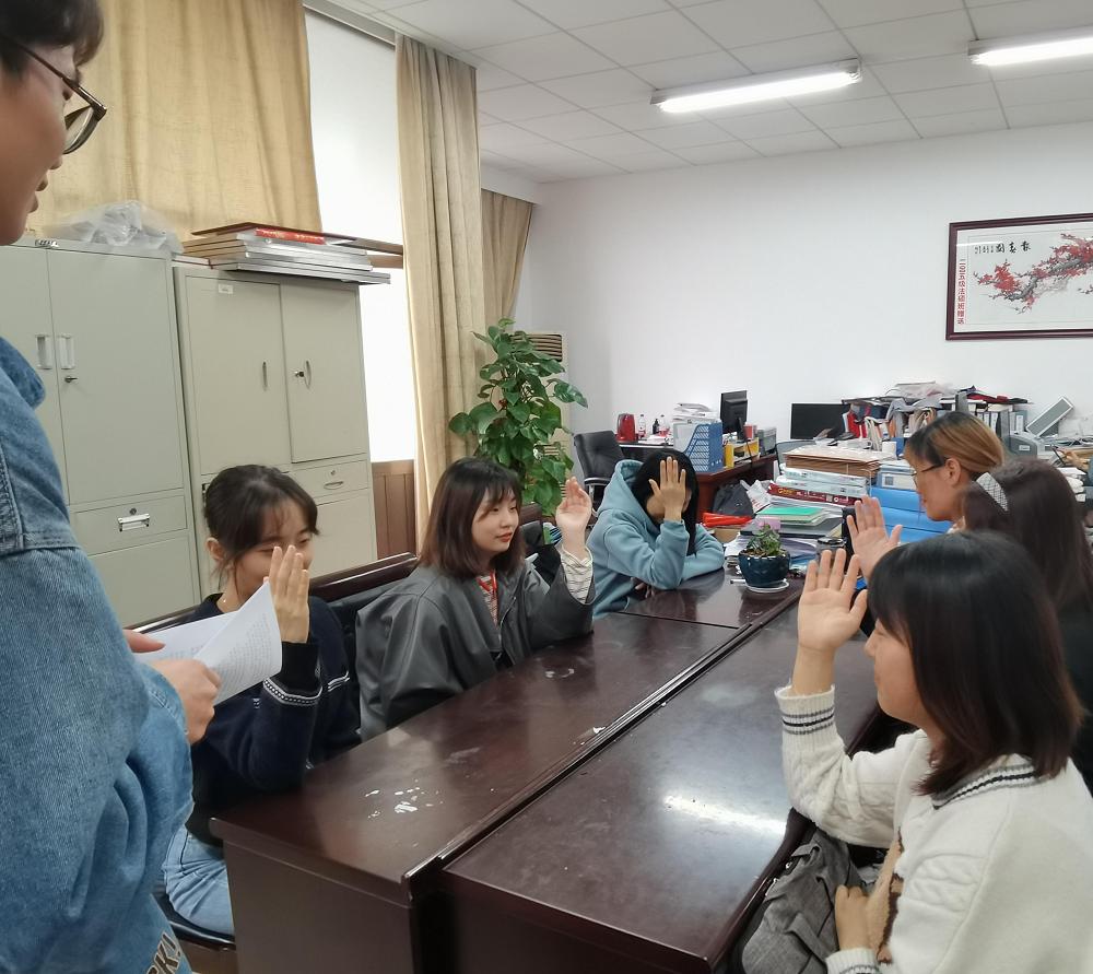 首先,闫振振老师向参会人员宣读了此次会议的流程并做委员候选人产生情况说明。本次会议采取民主投票方式,现场表决,差额选举产生常代会委员,以保证选举过程的公开透明和结果的公平准确。费梓萱同学、洪潇玲同学、沈玥同学三位候选人理想信念坚定、道德品行优秀、表率作用突出、群众基础良好,符合推选标准,此前经过学院团委组织部审核同意和学院团委召开团委全体会议研究后,成为了常代会委员候选人。