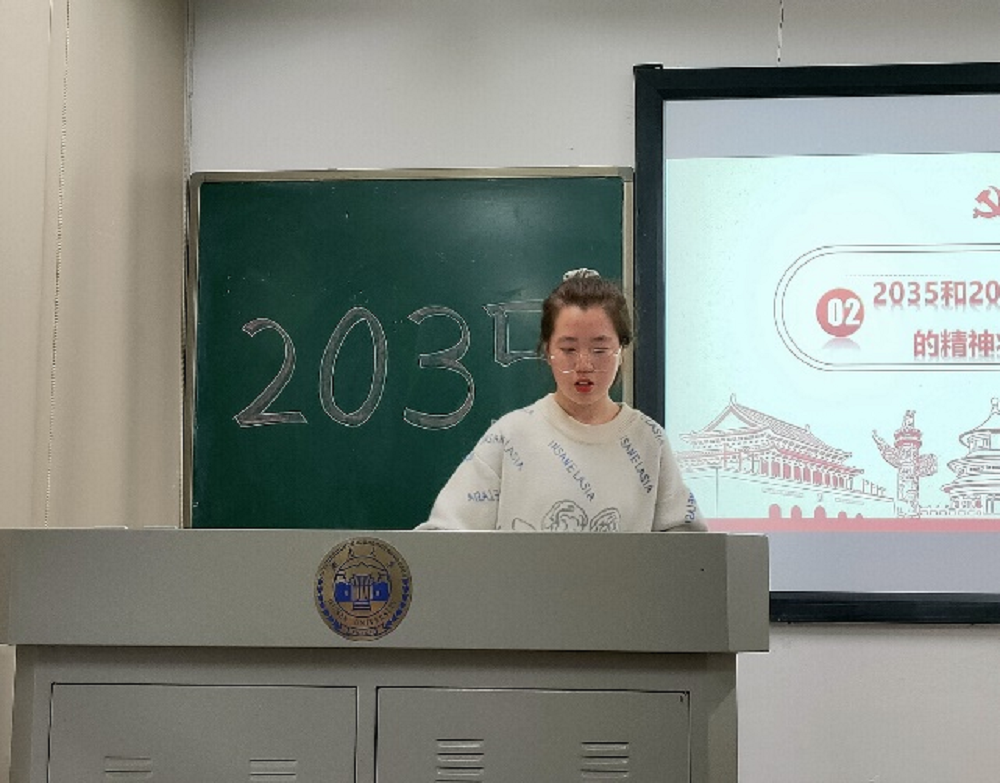 首先,团支书刘宇彤同学为大家引入2035年远景目标与当代青年的密切联系,并先后介绍四个主要部分:“六个讲清楚”、2035和2050青少年应有的精神状态和担当、十九届五中全会精神、习近平总书记考察麻豆瓜网