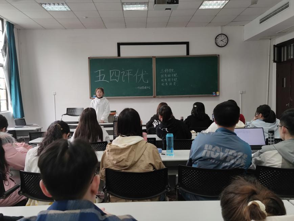 会议伊始,团支书陈欣宣读评选细则,明确了评选的项目和条件。此次五四评优同学们积极参与评选,周新梅、段瑞洋、刘昱呈等八名同学积极参加并按照顺序以此发言,讲述自己的优势和所获得的成果,展现了竞选同学在学习与生活各方面取得的优秀成绩。本次评选采取无记名投票方式,发言结束后,团支部全体成员秉持公平公正的原则投出自己的一票。由许文洁唱票,张荣计票,最终评选刘昱呈为“三好学生”、卢艺文为“优秀班干部”、段瑞洋为“优秀团干部”、周新梅为“优秀团员”。他们表示将在接下来的学习生活中继续提高自身素质,发挥带头作用,不辜负同学们的期望。在主持人进行唱票公示结果后,会议圆满结束。