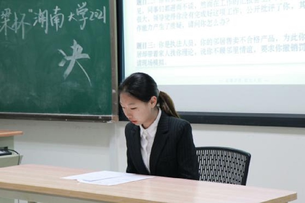 本次决赛面试以结构化面试形式进行,共三道考试题目,考生在思考室思考看题时间5分钟,后进入面试教室作答,作答时间5分钟。面试教室设有五名面试官、一名计时人员和两名计分人员,考场外设有引导人员和纪律监督人员,整场面试公平公正、严肃认真。