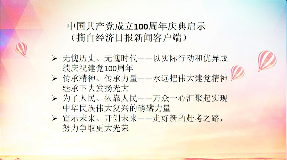 考察调研时的重要讲话精神。习总书记的嘱托激励着同学们坚定理想信念,牢记青春使命,以青春之我、奋斗之我,投身新时代中国特色社会主义的伟大实践。接着,同学们又共同观看了习近平总书记在庆祝中国共产党成立100周年大会上的重要讲话。习近平总书记“七一”重要讲话回望光辉历史、擘画光明未来,同学们对此感悟良多。