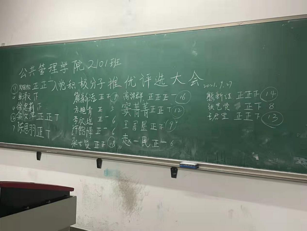 9月27日下午,行政管理2101班团支部于综合楼419教室举行入党积极分子推优评选会。本次会议由团支书高泽群主持,院团委组织部干事全程监督,行政管理2101班团支部全体成员参加。