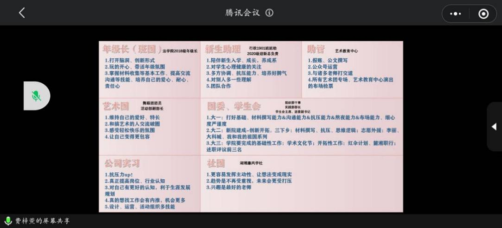 为帮助同学们更好地适应大学生活,费梓萱同学以自己丰富的大学经历为例,向营员们分享自己的学习及工作经验。从教会她团队合作的新生助理职务,到让她学会包容的艺术团经历,再到帮助她明确生涯规划的公司实习经历,费梓萱同学通过这一段又一段经历的讲述,为大家未来的大学生活与学习的规划提出了很多宝贵建议。她鼓励营员们在大学不断扩展自己的视野,培养各方面的能力,珍惜大学的试错机会,不断提升自己的综合素质。