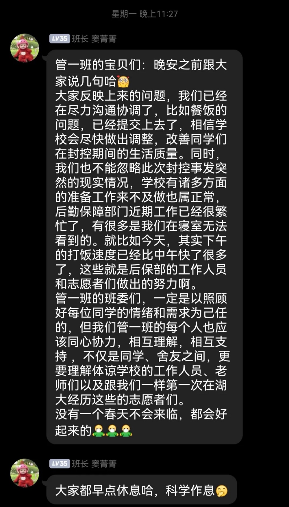 二区一栋二层层长李欣瑶同学说道:“其实我真觉得自己当上层长以来并没有做很多事情。后勤人员、志愿者同学和老师们做了更多,我只是做最后的落实工作。这些天里最大的感受应该是感谢吧,我看到的、遇到的其他层长和志愿者同学都是那么善良和负责,大家都迫切地希望为学校的防疫工作做些什么。宿管阿姨们也很关照我们,在我帮红码寝室送水的时还会反复叮嘱我要消毒戴手套。同时,二层的同学们也很配合我们的工作,这些天我觉得大家情感上的距离拉近了很多!封控的情况下,我自己也更安静了下来,注意到了一些以前从来没有发现的细节,比如一些很爱运动的同学喜欢在什么地方打球、后勤人员总会在傍晚准时来清理垃圾、早上八点会有工作人员给我们楼栋送来热水、晚上十点半食堂工作人员才结束一天的疲惫,在昏黄的灯光下开始洗漱......总之,希望疫情快快好起来,大家可以在真正升温前再次拥抱春天!”