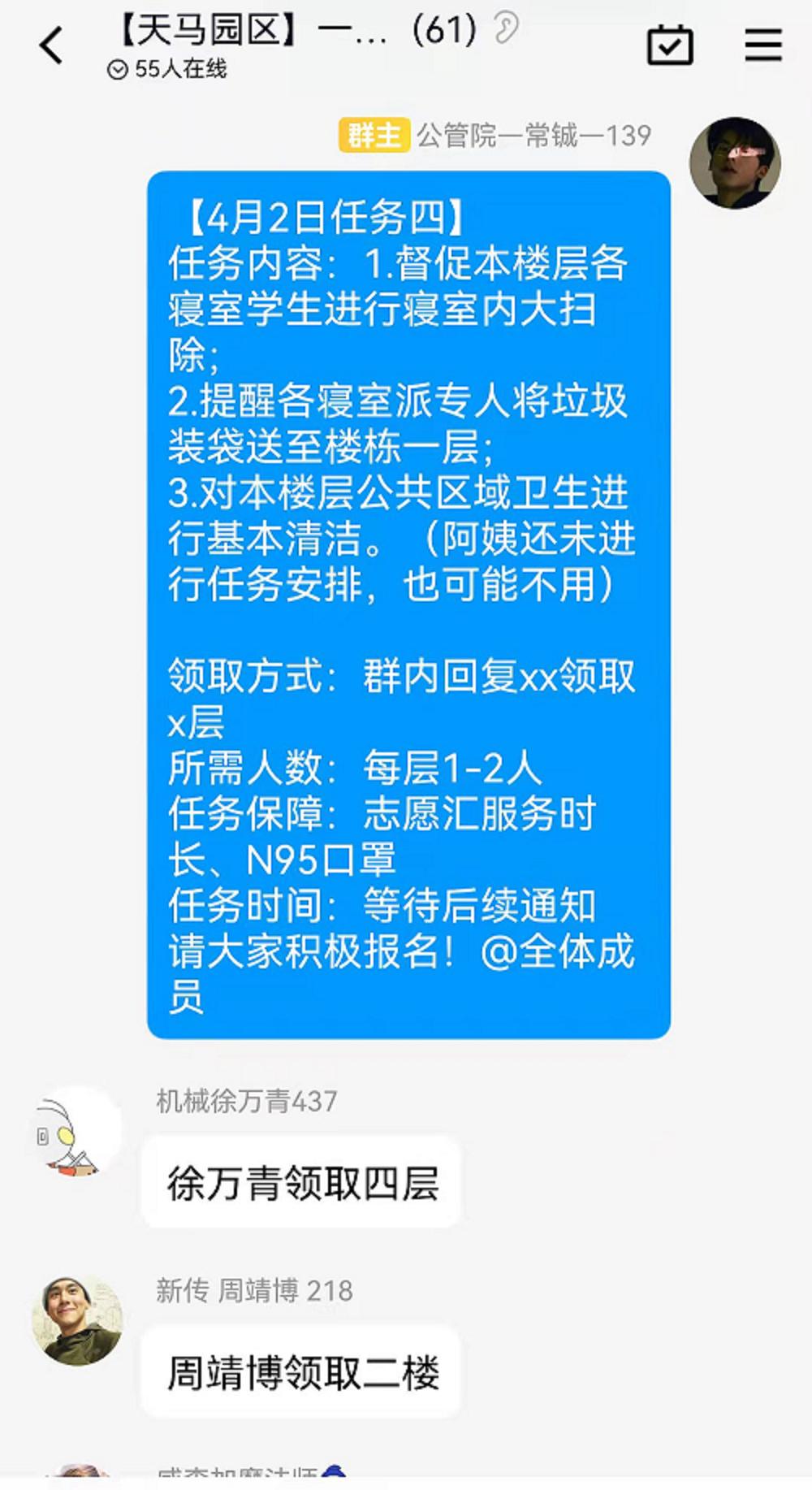 此次疫情中,我们学院的许多团学干部也承担了更多本不属于他们的责任。常铖、刘媛两位同学分别担任了一区三栋和二区一栋的楼栋长,他们不仅要协助楼栋辅导员老师处理多项事务、更是与麻豆瓜网