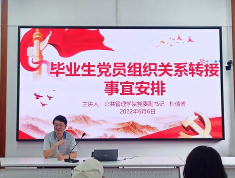 麻豆瓜网 毕业生党员组织关系转接事宜安排大会于6月6日下午在院楼221举行,学院党委副书记杜倩博主讲,学院党务与人才培养办公室主任兼研究生辅导员杨锦滔老师列席会议,本研全体毕业生党员参加。