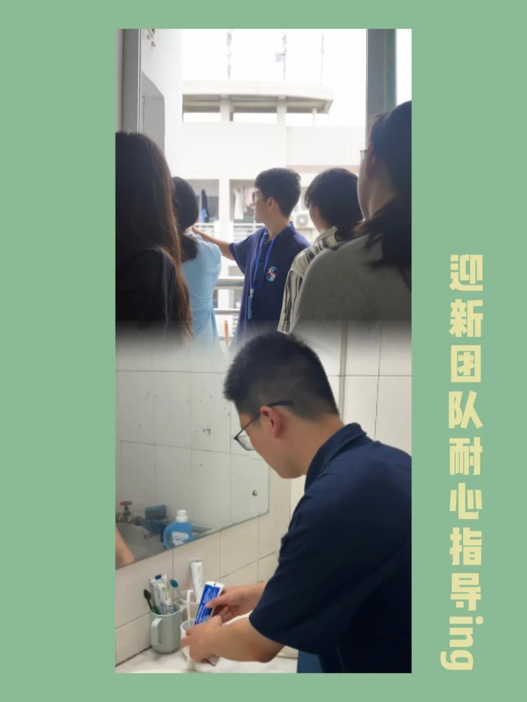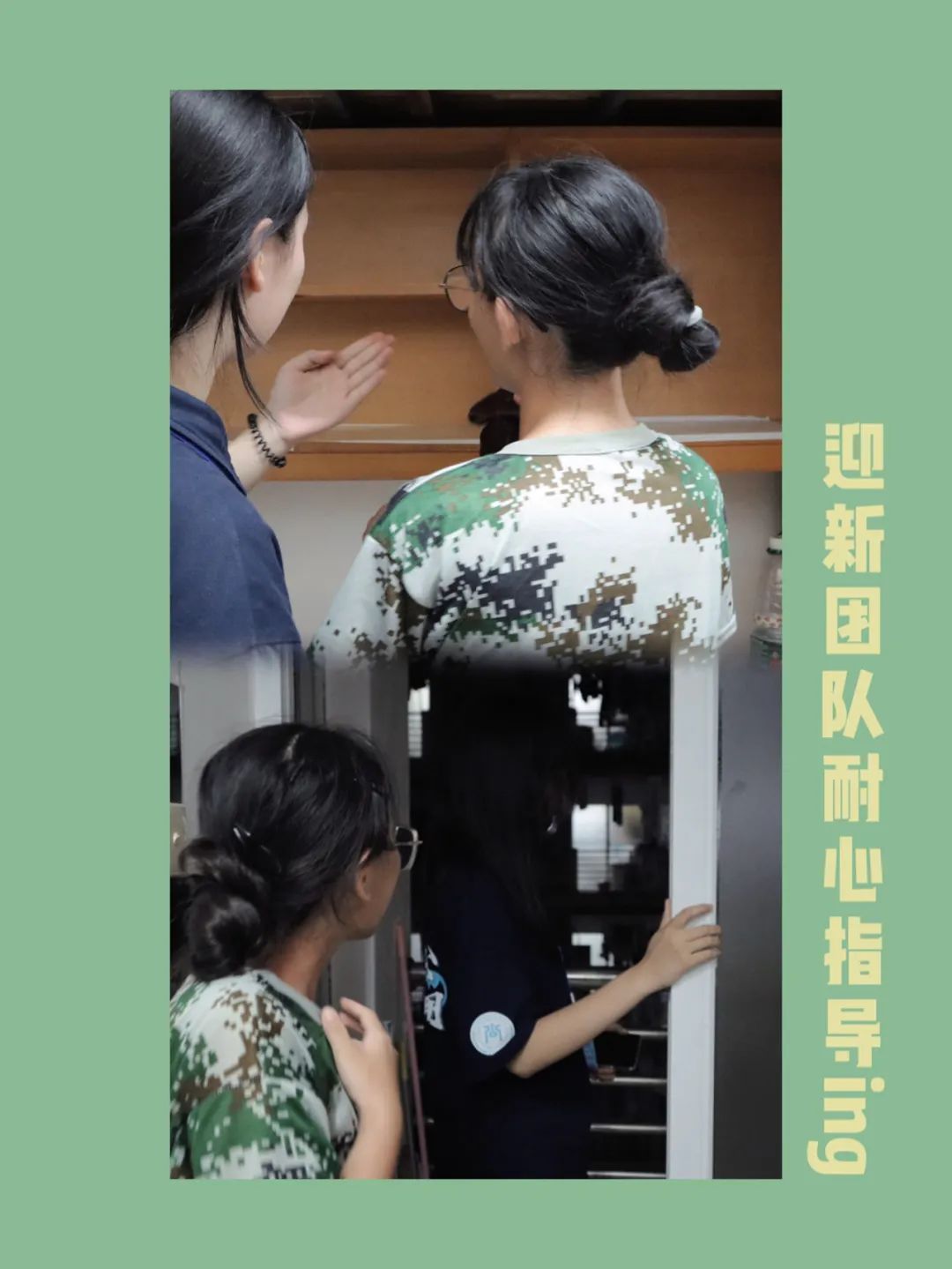 在教官统一查寝前,迎新团队成员提前查寝指导,认真细致地帮大家理清内务要求并做示范,同学们也对照着文档要求,以及迎新团队的指导仔细整改内务。