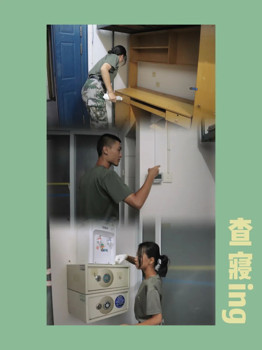 正式查寝时,呈现在教官面前的是严谨方正的“豆腐块”、有序摆放的洗漱用具、洁白透亮的洗手池、干净整洁的桌面、衣物悬挂整齐的衣柜....