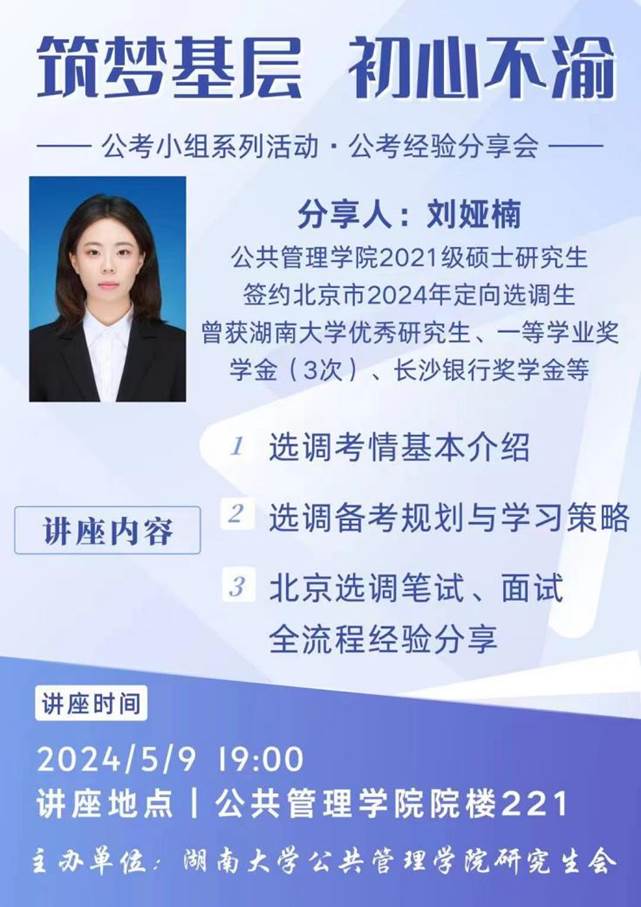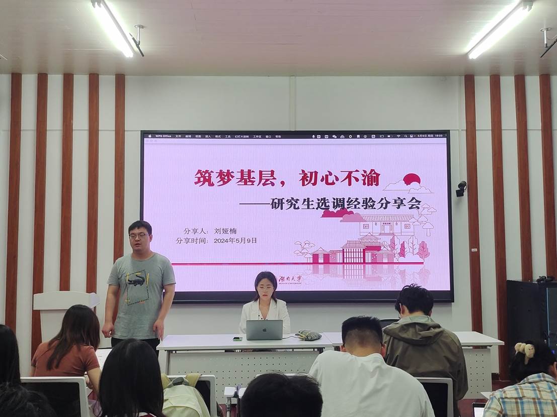 5月9日晚,麻豆瓜网 于院楼221教室举行公考小组系列活动之公考经验分享会。本次分享会由院研究生会发展服务部组织,邀请了刘娅楠同学作为主讲嘉宾,主题为“筑梦基层、初心不渝”。本次分享会反响热烈,效果良好,极大提升了同学们的备考热情与效率,进一步促进了麻豆瓜网 就业工作高质量发展。