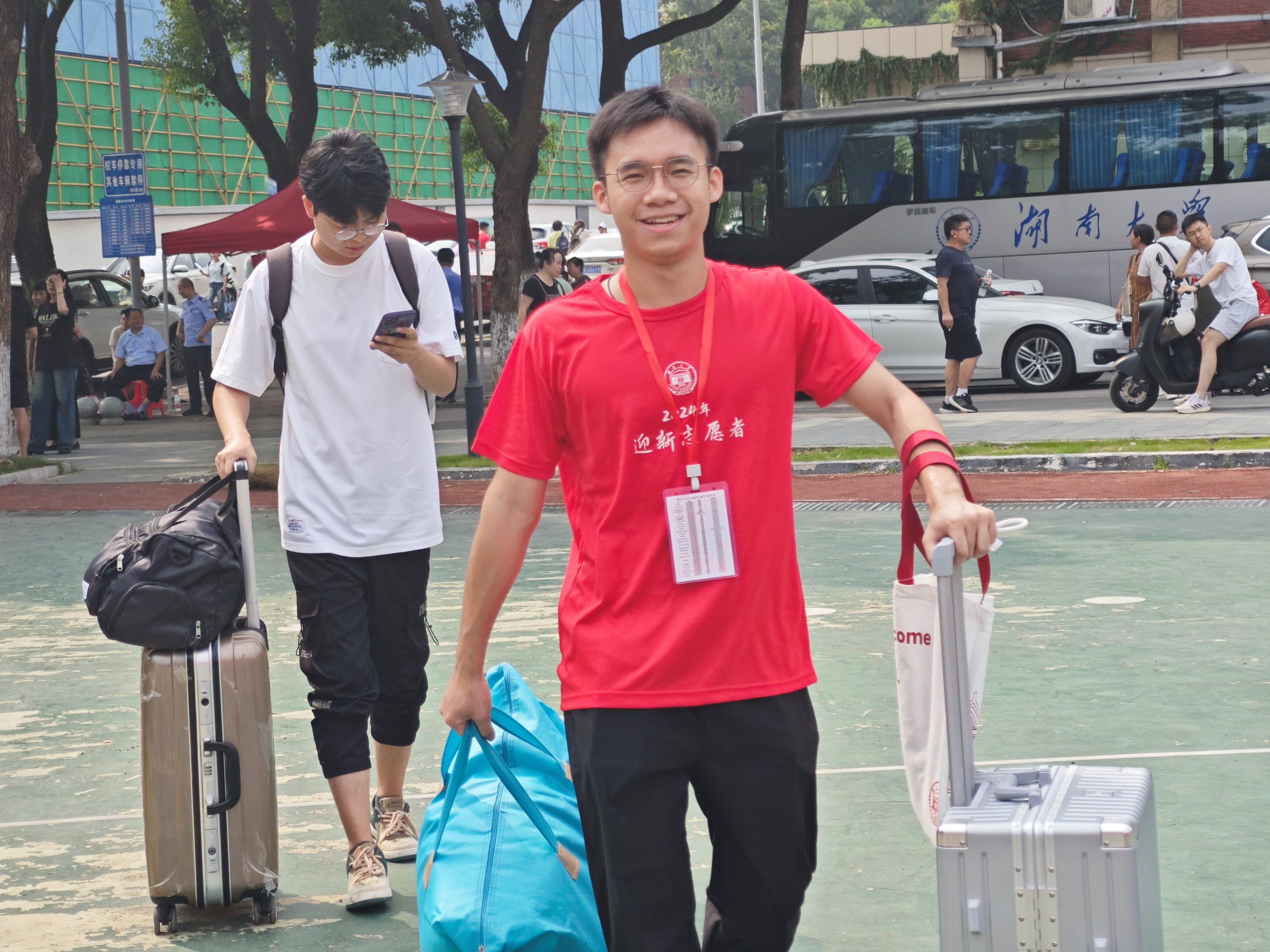 师生迎新团队有条不紊地推进迎新工作,从望麓桥学生公寓到财院校区,再到南校区,处处可见新生、志愿者和老师们忙碌的身影。湖大的标志性红色在阳光的照耀下更加鲜艳,见证了一个个温馨而美好的瞬间。