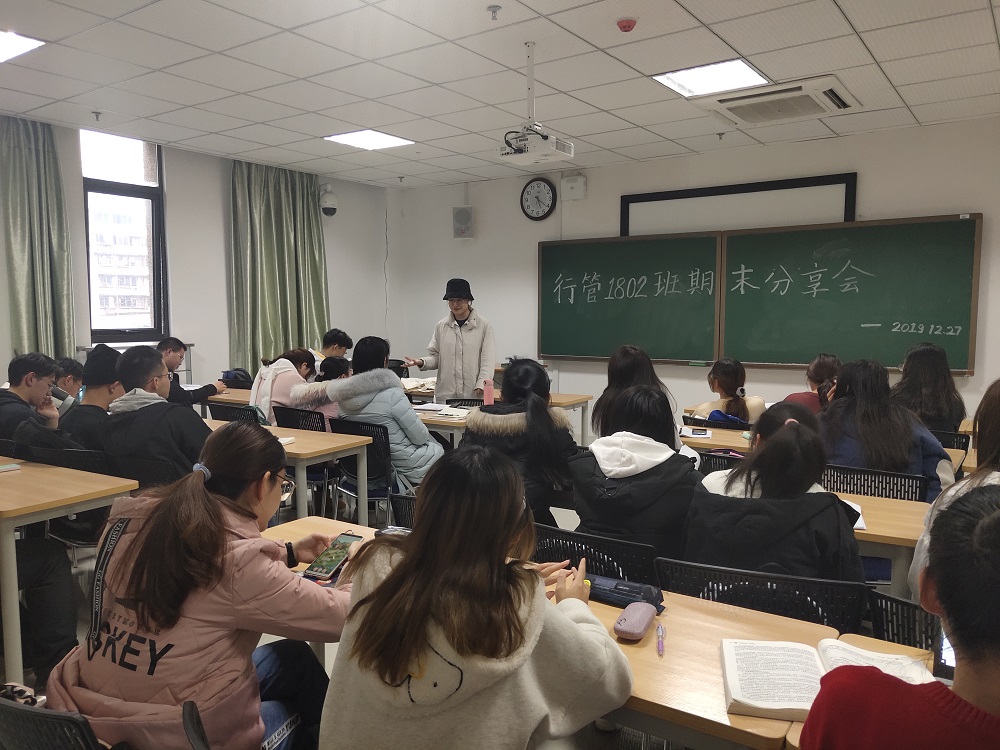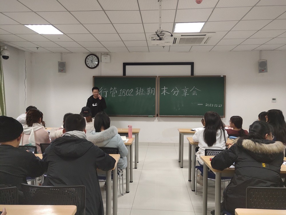 为帮助同学们进行期末总结复习,提高班级学习成绩,降低班级挂科率,促进优秀班级建设,12月27日下午,行政管理1802班在研究生院楼开展期末学习经验分享交流会。本次活动由腊炳辉主持,邀请2017级学长学姐石一琨、颜亚丽、胡鑫雅参与,行管1802班全体参加。