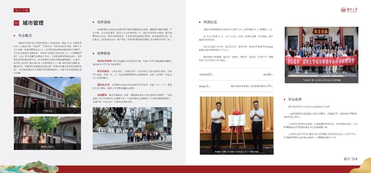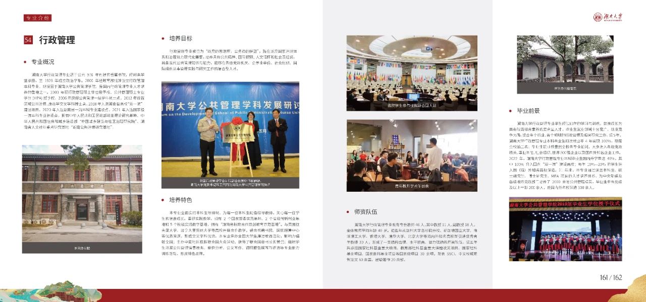 设有行政管理、城市管理2个本科专业,其中行政管理为国家级一流本科专业建设点,构建了涵盖本科生、科学学位研究生、专业学位研究生以及博士研究生的人才培养体系。学院拥有湖南省校政、校社合作双创教育示范基地。公共管理硕士(MPA)项目享有盛名,致力培养“引领社会、服务公众”的公共管理精英,为中央部委、湖南省各级政府部门培养了超2000名优秀人才,为地方经济与社会发展做出了重要贡献。