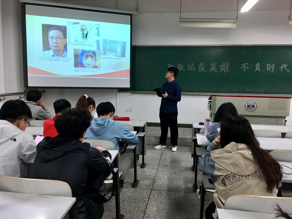 随后,同学们一起观看抗疫战士的相关视频。新型肺炎疫情发生以来,84岁高龄的钟南山院士每天都在奋战,满腔热血为国为民,令同学们肃然起敬。“既是医者,也是患者”的张定宇院长坚守在抗疫最前线,“我必须跑得更快,才能从病毒手里抢回更多病人。”作为渐冻症患者的他每天几乎只睡2个小时,即便是休息时间,也不停地接电话、翻看病历。为国奉献的抗疫英雄让同学们无比动容。