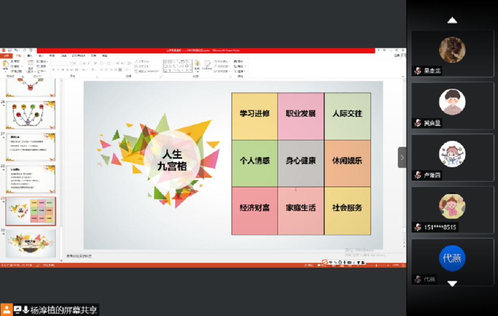 整个讲座围绕同学们在学习生活中遇到的问题,将人生划分为三个维度九个板块,分别是学习进修、职业发展、人际交往、个人情感、身心健康、休闲娱乐、经济财富、家庭生活、社会服务。针对每一个维度的问题,杨老师引导大家去评估当下的状态,建立理想目标。