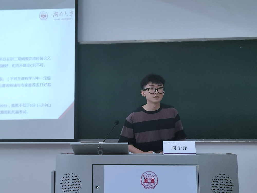 继而,成功获得中山大学攻读博士学位资格的周予洋向大家介绍了申请博士的流程、注意事项和相关建议,其分享内容主要包括“需要思考的几个问题、如何备考、考试技巧和申请成功后的工作”四个方面。他建议在选择之前应结合自身特点认真思考再理性决策是否考博。其次,他强调研究计划书是申请材料中的重中之重,应认真准备。最后,他建议在申请成功之后仍应保持良好的学习状态,同时还需要加强身体锻炼,为未来博士生涯打好坚实的基础。
