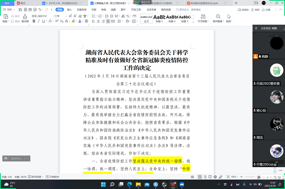 行政管理专业2020级全体成员参会。培训主题为法律法规与行为准则,会议聚焦于学习与解读以下三份疫情防控政策文件:《中华人民共和国传染病防治法》、《湖南省人民代表大会常务委员会<关于科学精准及时有效做好全省新冠肺炎疫情防控工作的决定>》、《公民防疫基本行为准则》。