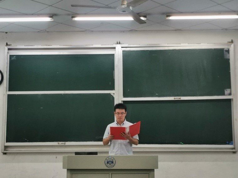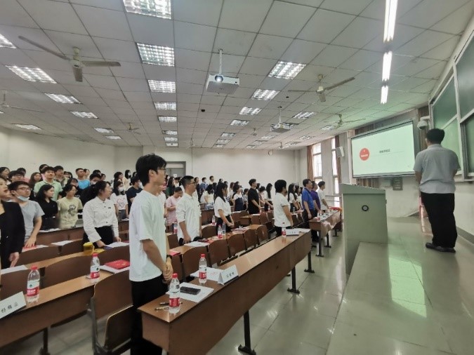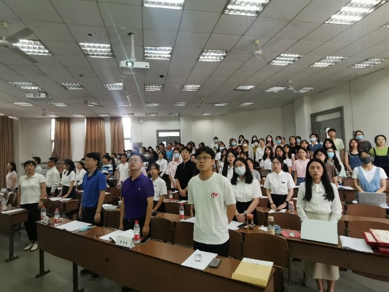 预备会议后开始第二阶段的正式会议。正式会议由研究生助理辅导员邢梦阳主持,会议伊始,全体人员起立,奏唱国歌。