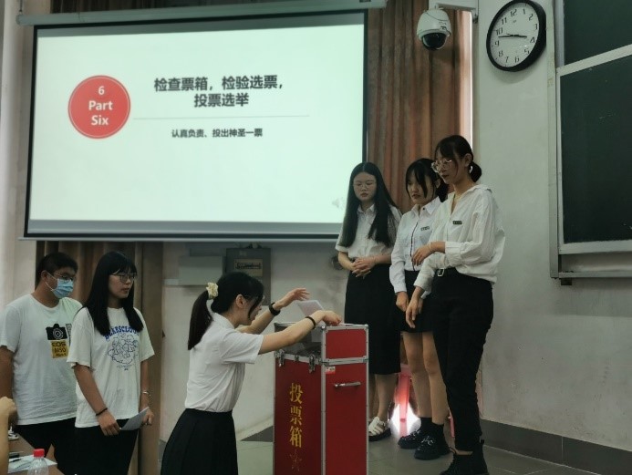 竞选演讲结束后,监票人检查展示票箱,计票人展示选票、清点人数并发放选票。参会人员依次上台进行投票,由王佳丽、李金楠和雷梓榆同学进行监票,杨聆、万家桢、刘昱呈同学进行计票。
