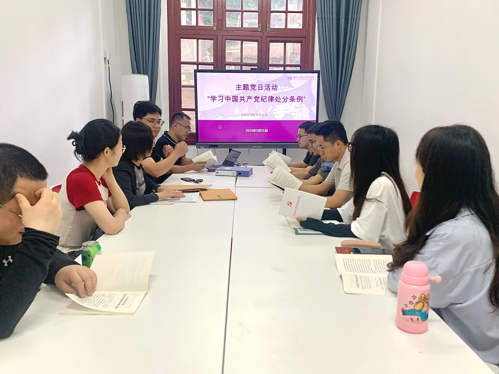 为深入学习贯彻习近平总书记关于全面加强党的纪律建设重要论述,落实党中央关于开展党纪学习教育的重要决策部署,进一步加强党员纪律教育,引导广大党员在工作和生活中严守党的纪律,发挥先锋模范作用,2024年5月28日,行政管理研究党支部开展“学习中国共产党纪律处分条例”主题党日活动。
