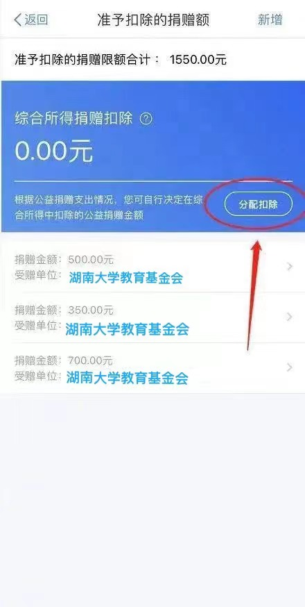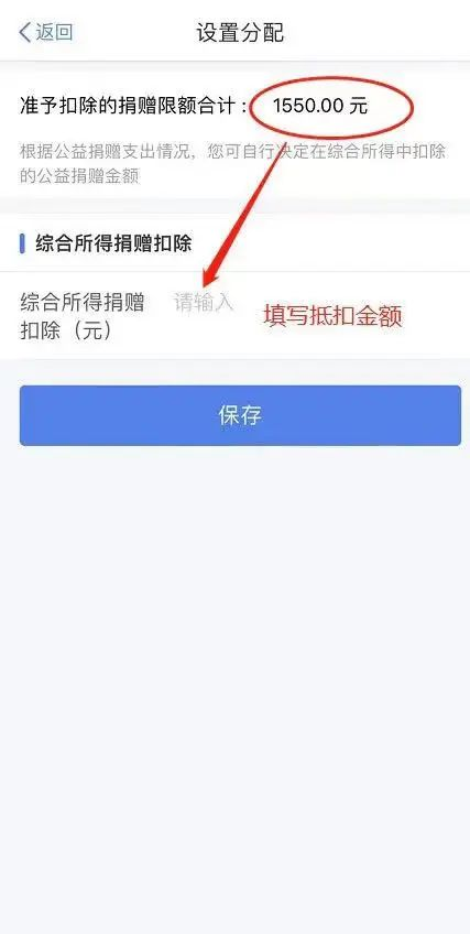 4. 一次可填写一张捐赠票据,如您有多张捐赠票据,请依次填写并“保存”。保存后继续“新增”,待全部捐赠票据登记结束后,即可进入下一步。所有捐赠票据信息输入完毕后,在页面选择“分配扣除”,填写“综合所得捐赠扣除金额”,点击“保存”即可。